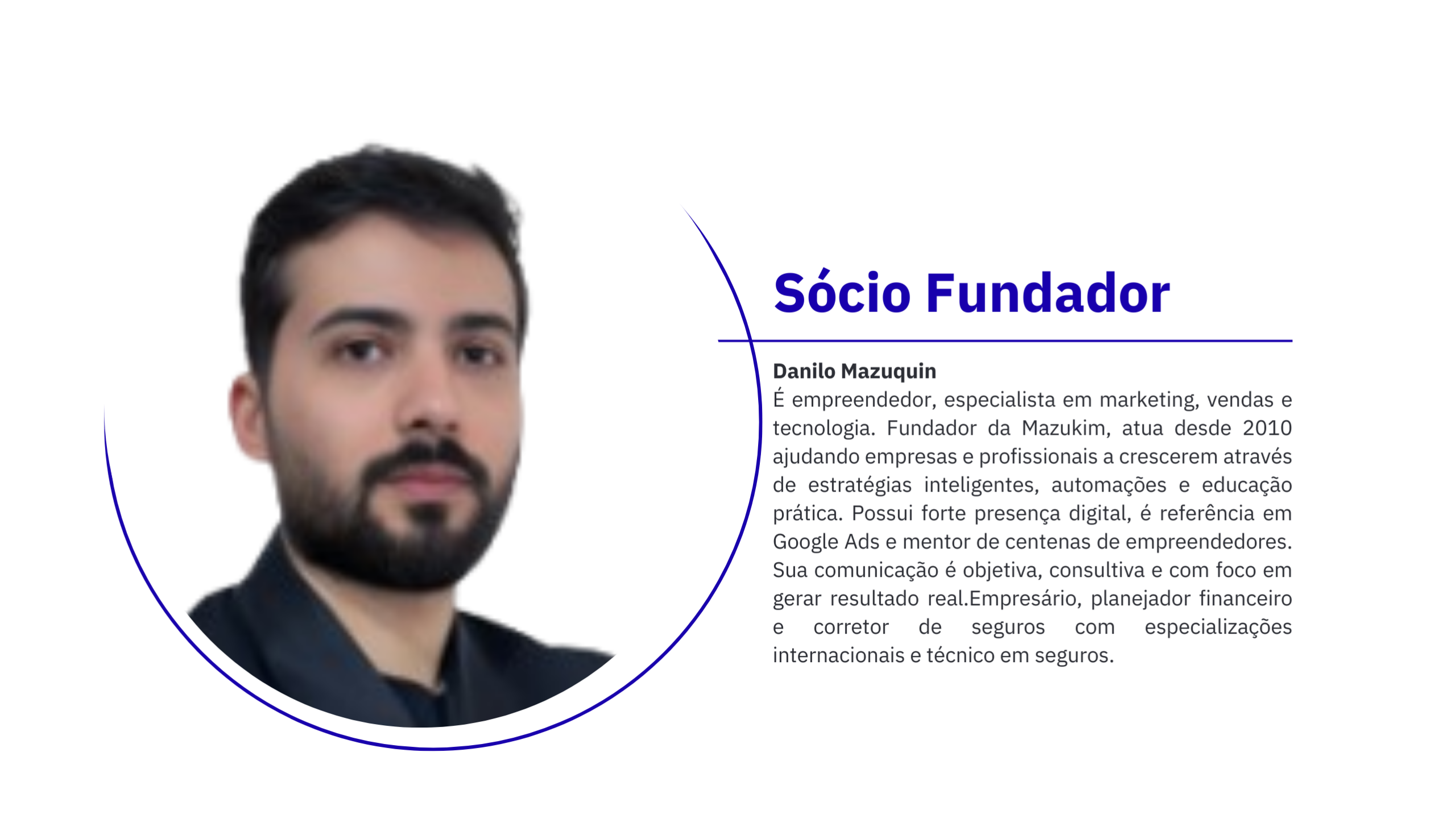 Danilo Mazuquin é empreendedor, especialista em marketing, vendas e tecnologia. Fundador da Mazukim, atua desde 2010 ajudando empresas e profissionais a crescerem através de estratégias inteligentes, automações e educação prática. Possui forte presença digital, é referência em Google Ads e mentor de centenas de empreendedores. Sua comunicação é objetiva, consultiva e com foco em gerar resultado real.